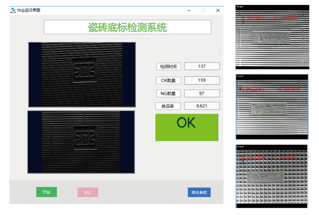 應(yīng)對(duì)勞動(dòng)力成本攀升和自動(dòng)化升級(jí)的需要,針對(duì)陶瓷行業(yè)多種品牌瓷磚混燒下磚時(shí)有其他品牌瓷磚混入的情況,開發(fā)了窯尾陶瓷底標(biāo)識(shí)別系統(tǒng),識(shí)別非目標(biāo)品牌并進(jìn)行剔除,同時(shí)能夠支持目標(biāo)識(shí)別品牌的快速切換,便捷的的作業(yè)設(shè)置,簡單的參數(shù)調(diào)節(jié),應(yīng)用于TOP陶瓷生產(chǎn)企業(yè)。